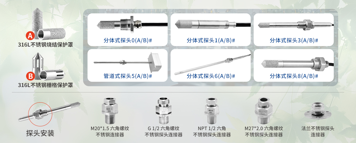 應用于冷凍式干燥機、吸附式干燥機等對濕度要求極其嚴格的工況,也可作為零部件安裝在干燥系統、壓縮空氣系統等工業應用的設備上,用以檢測氣體中的實際潮氣。